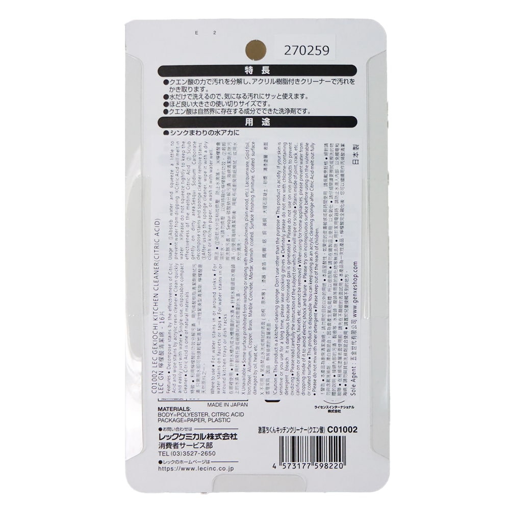 強烈刺激的化學清潔劑都沒能潔去的頑固污垢需要的可能就是針對性的除垢對策。在日本被瘋搶回購的LEC 激落君檸檬酸清潔綿針對面料和污垢的類型,無需加添任何額外清潔剷,只需一片海綿,以天然成份的清潔方式有效快捷去除並分解污垢。• 天然檸檬酸有效分解頑固水漬水垢• 薄片海綿設計,更容易貼合清潔,狹窄縫隙都能輕鬆潔淨• 海綿獨特結構只需加上清水便會釋出檸檬酸,方便一濕即洗• 適用於水龍頭﹑洗碗盤• 尺寸輕便薄片,適合一次性使用,即棄更衛生• 日本製造