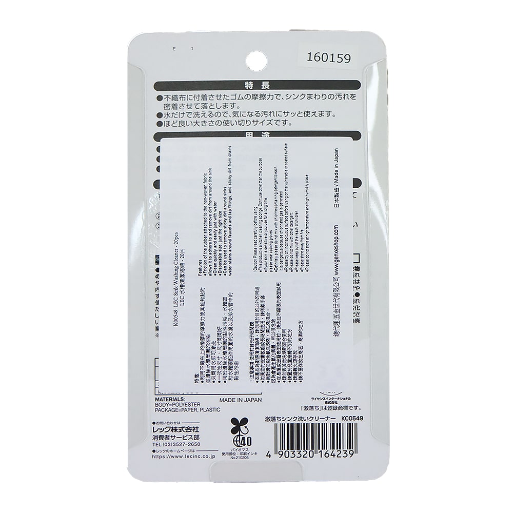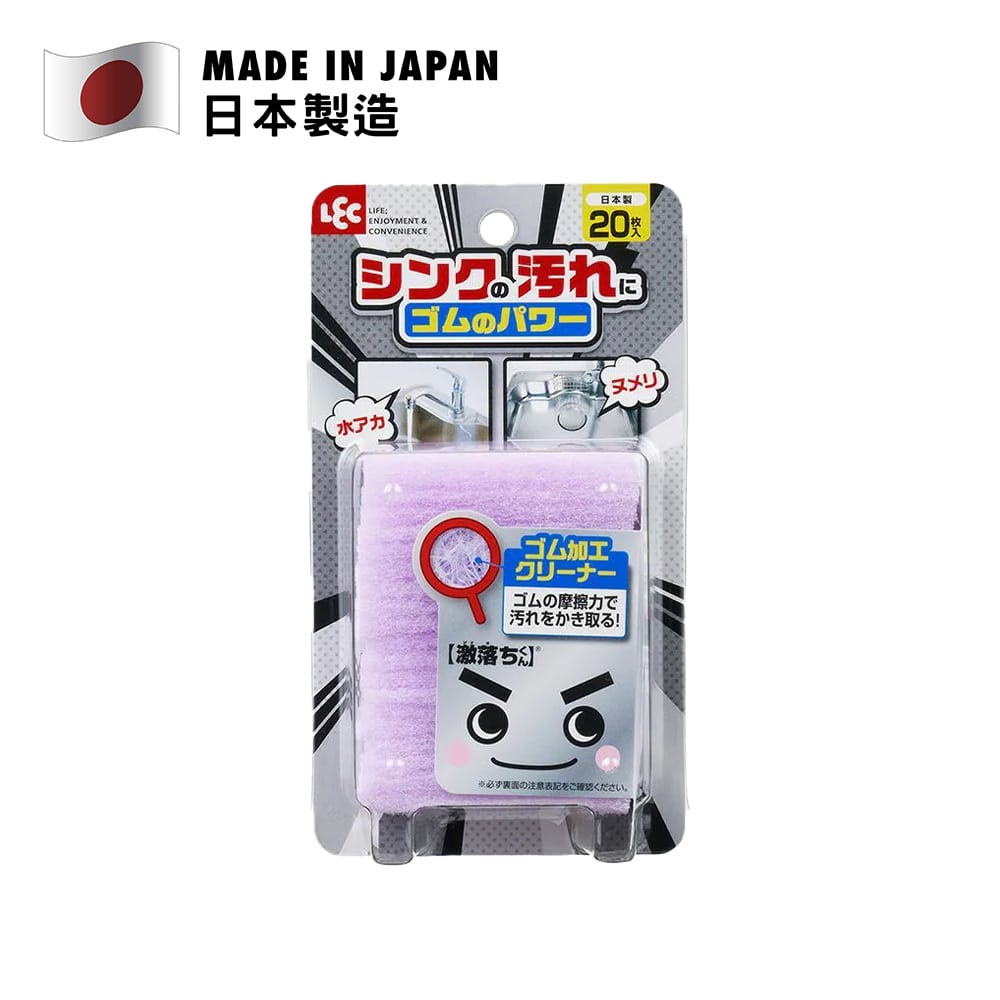 水槽上總有使用後的的水漬和洗淨食具後的油污?LEC激落君水槽清潔海綿為你輕鬆洗淨水槽的污漬,以獨特的黏性和摩擦力把污垢吸附潔淨,還你煥然一新的水槽!• 橡膠加上尼龍不織布的獨特摩擦力輕易黏附並清除水槽周圍的污垢• 有效去除水槽周圍的黏性污垢、水龍頭和水龍頭配件周圍的水漬• 只需加上清水便會釋出清潔劑,方便一濕即洗• 尺寸薄片輕便,適合一次性使用,即棄更衛生• 日本製造