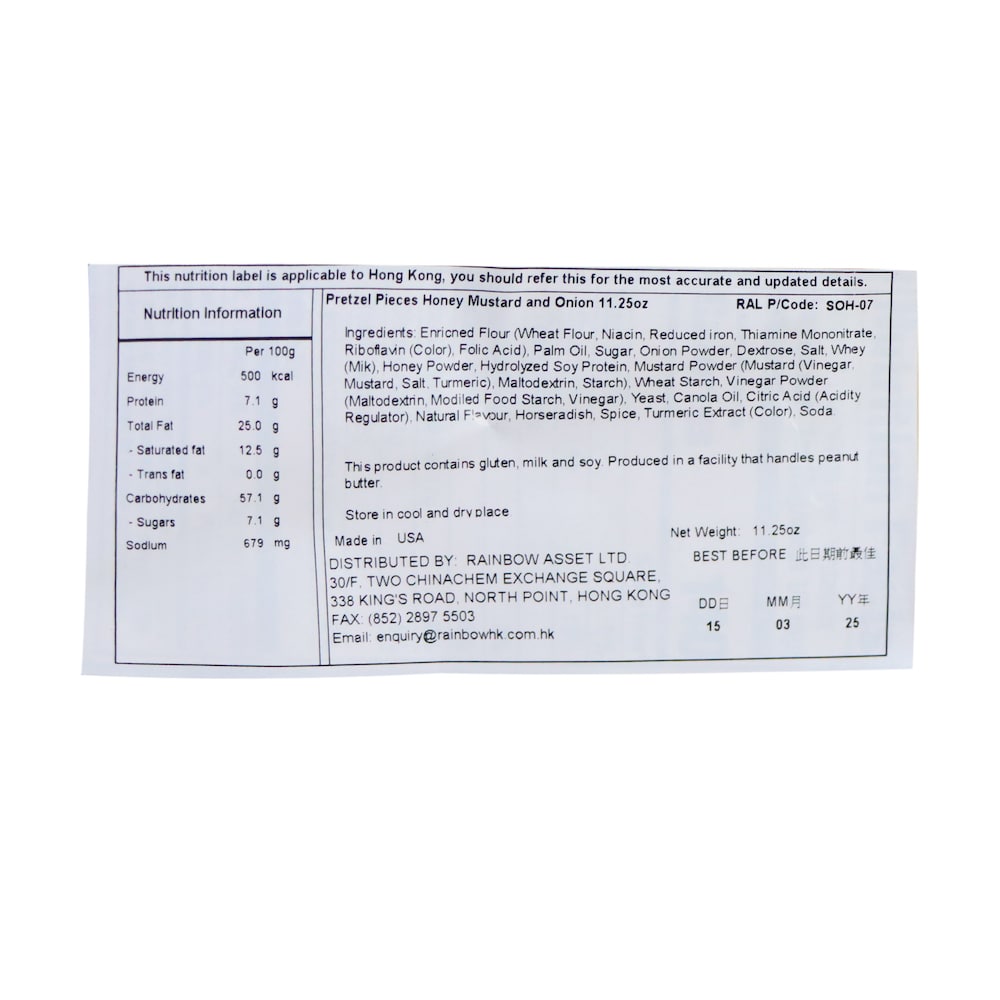 Snyder's 以傳統方法製作的蝴蝶脆餅,製成脆片後加入蜜糖、芥末、洋葱調味,每一口都充滿大膽的風味,香脆可口。