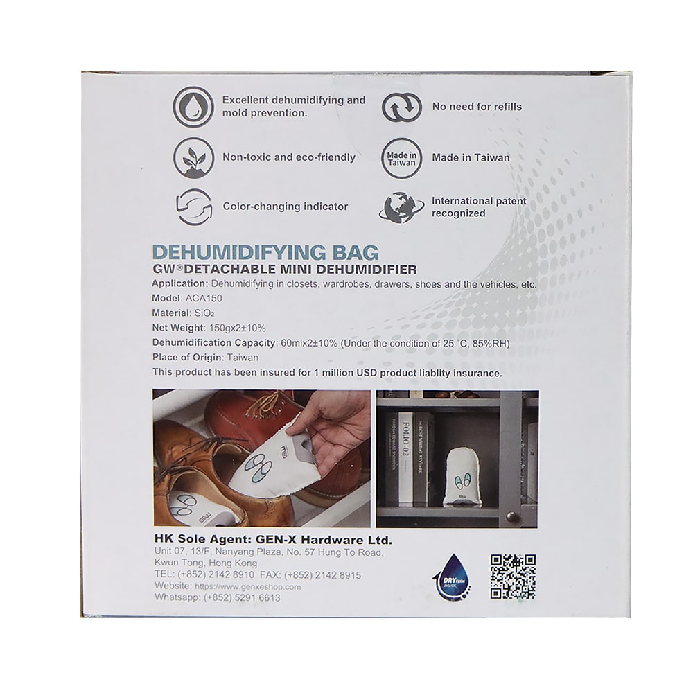 • Sodium Silicate dehumidifying with approximately 5 times higher dehumidifying power than regular disposable dehumidifiers